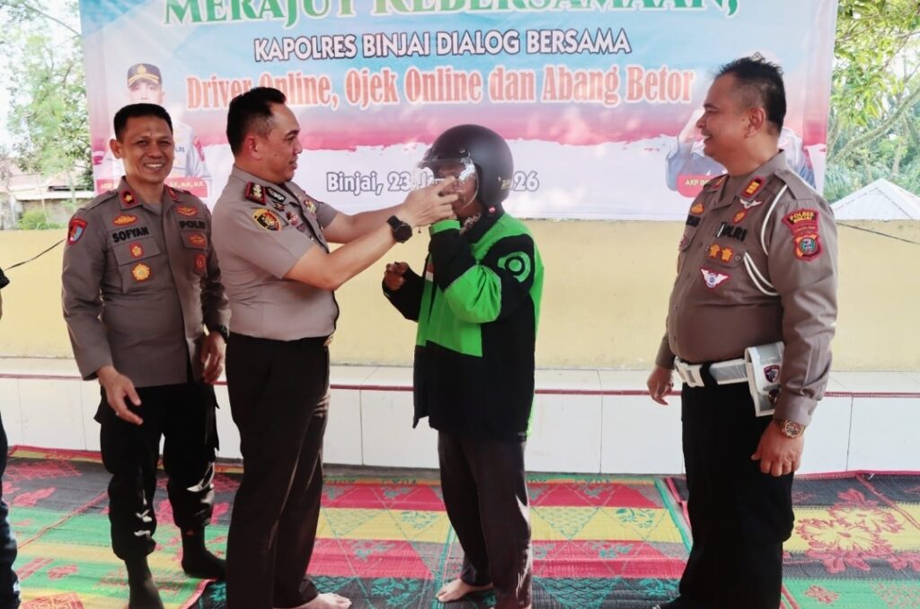KitaMonitor – BINJAI | Dua minggu menjabat sebagai Kapolres Binjai, AKBP Mirzal Maulana, S.I.K., S.H., M.M., M.H., menggelar dialog bersama para driver online, ojek online (ojol), dan pengemudi becak motor (betor) di area parkir Mapolres Binjai, Jum’at sore (23/1).